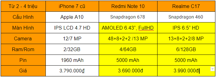 Bảng so sánh phân khúc từ 2 - 4. Phân khúc giá này thay vì chọn iPhone 7 cũ. Chúng ta có thể chọn Redmi note 10 Hoặc Realme C17.