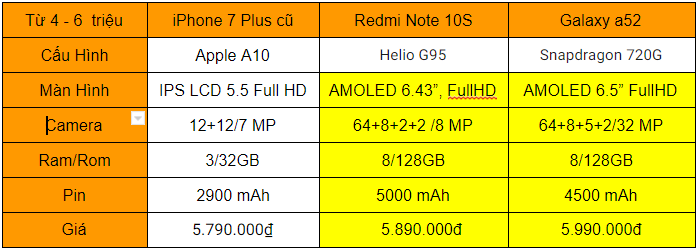 Bảng so sánh phân khúc từ 4-6 triệu. Phân khúc này chúng ta có thể chon Redmi Note 10S và Galaxy A52 thay cho iPhone 7 Plus cũ.