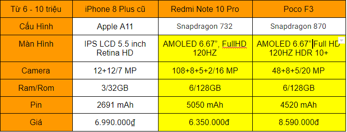 Phân khúc giá từ 6-10 thì chúng ta có thể chon Redmi Note 10 Pro và Poco F3 để có trải nghệm tốt hơn hoàn toàn so với iPhone 8 Plus cũ.