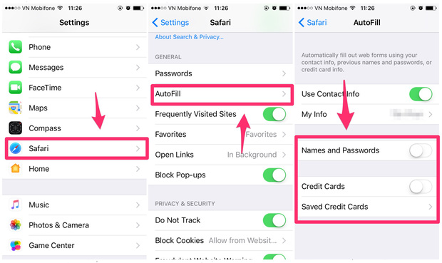 Đây là một tính năng rất hữu ích để bạn không cần phải điền thông tin đăng nhập hoặc thông tin thẻ tín dụng cho một trang web nào đó. Tuy nhiên nó sẽ rất nguy hiểm nếu bạn hay đưa máy cho người khác dùng, đặc biệt là trẻ con vì những thông tin này có thể bị rò rỉ ra ngoài nếu bất cẩn. Để vô hiệu hoá, hãy vào Settings > Safari > AutoFiil > tắt Names and Passwords và Credit Cards.