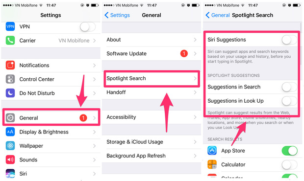 Chúng ta có thể tìm kiếm toàn bộ thông tin trong máy bằng cách vuốt xuống ở màn hình chính của iPhone. Nhưng mỗi lần tìm kiếm như thế này hệ thống sẽ lưu thông tin lại để cải thiện tính năng này cho những lần tìm kiếm sau. Việc lưu lại thông tin có thể gây ra thừa dữ liệu trong bộ nhớ của iPhone, và nguy cơ cao bị rò rỉ thông tin tìm kiếm ra ngoài. Chúng ta có thể vô hiệu hoá bằng cách vào Settings > General > Spotlight Search > bỏ 3 mục đầu tiên.
