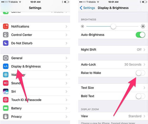 Các thế hệ từ iPhone 6s trở đi có tính năng “Raise to Wake”, giúp người dùng cầm máy lên là màn hình sẽ tự động sáng và người dùng không cần nhấn nút bật tắt màn hình. Tuy nhiên đối với một số người tính năng này không thực sự cần thiết và nó gây tốn pin đáng kể. Để vô hiệu hoá hãy vào Settings > Display & Brightness > tắt Raise to Wake.