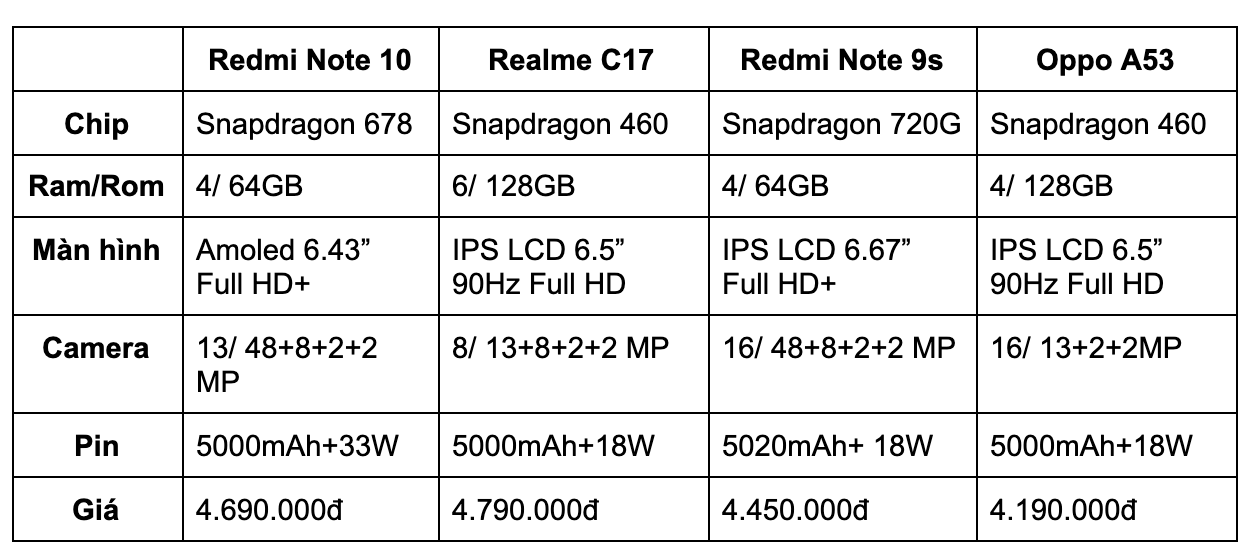 Trong tầm giá 4 triệu chúng ta có rất nhiều sự lựa chọn như Redmi Note 10, Realme C17, Redmi Note 9s hoặc Oppo A53. Dưới đây là bảng so sánh chi tiết cấu hình của các máy để các bạn tham khảo.