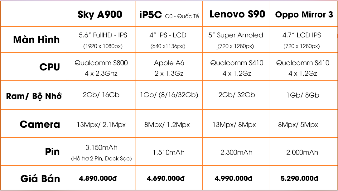 Còn với những sản phẩm cùng tầm giá như iPhone 5C 99% quốc tế, Lenovo S90 chính hãng, Oppo Mirror 3 chính hãng thực sự không có cửa để so với Sky A900 bởi hầu như tầm giá này đa số các thiết bị đều được trang bị Ram 1Gb, với con Chip tầm trung chỉ đủ để thực hiện những tác vụ cơ bản hằng ngày. Trong khi đó Với cấu hình và màn hình khủng, SKY A900 thực sự đáng gọi là một cỗ máy chiến đấu trong cả công việc và giải trí!
