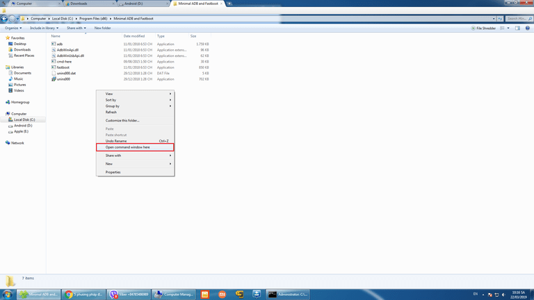 - Trong thư mục adb minimal fastboot giữ shift click chuột phải mở cửa sổ command.
