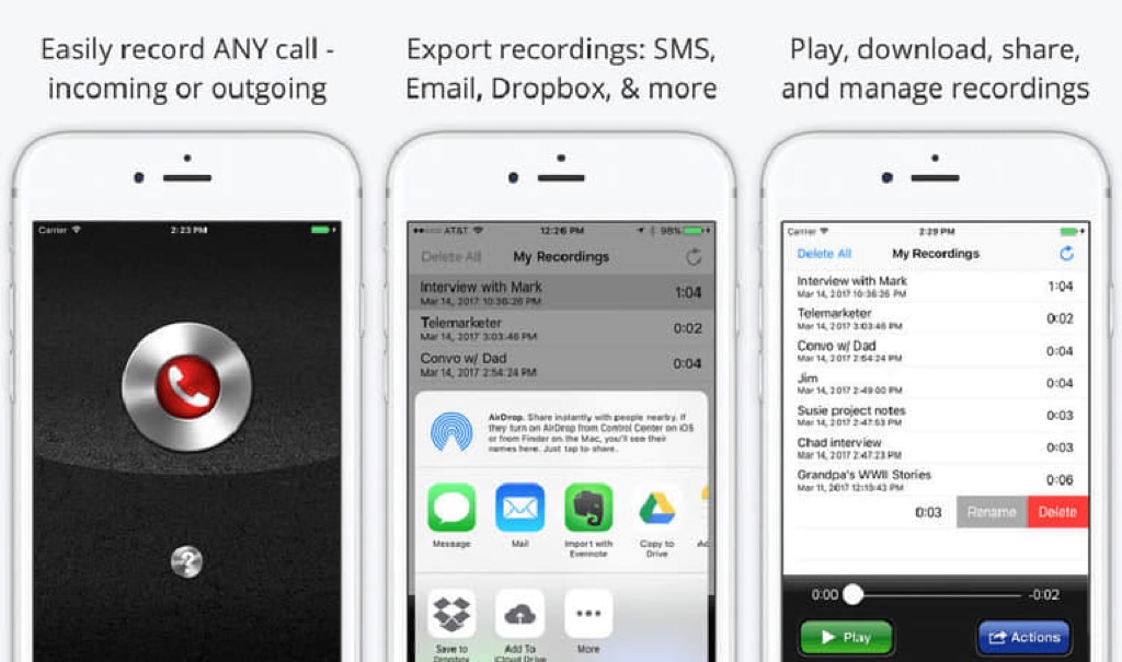 Call Record Pro có một số tính năng tiện lợi mà bạn có thể đặc biệt thích nếu bạn muốn thực hiện một số bản ghi ngắn, chất lượng cao. Lợi ích chính của ứng dụng này là nó cho phép bạn ghi âm miễn phí 300 phút. Bạn cũng có thể dễ dàng chia sẻ các bản ghi âm qua email, iMessage, Twitter, Dropbox và thậm chí là Facebook.