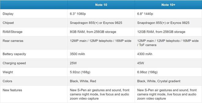 Thông số kỹ thuật của Galaxy Note10 và Note10+