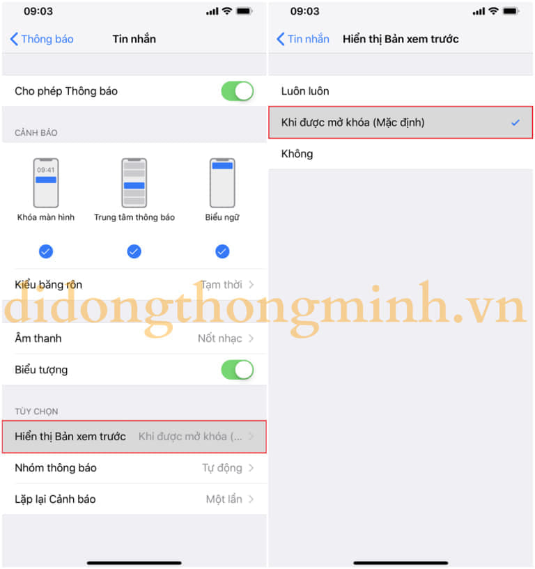 Tiếp theo, các bạn bấm vào mục Hiển thị bản xem trước rồi chọn dòng Khi được mở khoá để máy sẽ ngăn chặn việc hiển thị nội dung tin nhắn lên màn hình trong trạng thái khoá.