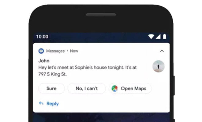Nếu trước đây khi nhận thông báo hay tin nhắn nào đó, bạn chỉ có thể lựa chọn phản hồi hoặc tắt nó đi. Thì bây giờ trên Android 10 còn thông minh hơn khi có thể gợi ý cho bạn những câu trả lời có sẵn hợp với ngữ cảnh, hoặc gợi ý đặt báo thức hay mở bản đồ,…