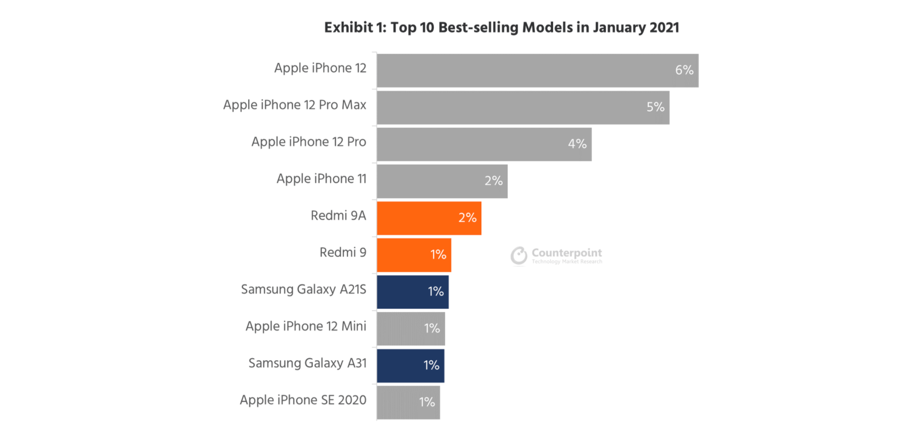 Theo dữ liệu thị trường do Counterpoint Research tổng hợp, Apple chiếm sáu vị trí trong top 10 mẫu điện thoại thông minh bán chạy nhất toàn cầu tính đến tháng 1 năm 2021, theo báo cáo Market Pulse của Counterpoint Research. Apple iPhone 12 dẫn đầu danh sách, tiếp theo là iPhone 12 Pro và iPhone 12 Pro Max. Ba mẫu iPhone 12 này đóng góp tới 71% tổng doanh số của Apple trong tháng.