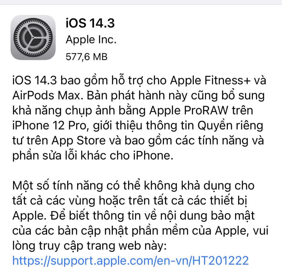 Dưới đây là ghi chú phát hành đầy đủ của Apple cho iOS 14.3, với bản tóm tắt đầy đủ về mọi thứ mới.
