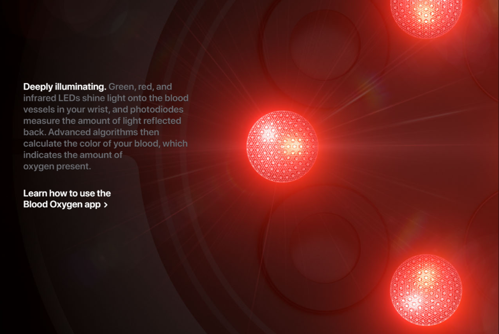 Nâng cấp lớn nhất cho Apple watch series 6 là ứng dụng đo độ bão hòa oxy trong máu, còn được gọi là SpO2. Ở mặt sau của máy được thiết kế cụm cảm biến hồng ngoại với 8 chấm nhỏ có đèn màu đỏ xếp thành một vòng tròn, trong đó các mẫu trước chỉ có một chấm lớn ở chính giữa. Đây là các cảm biến có chức năng đo màu máu của bạn và xác định phần trăm oxy trong đó.