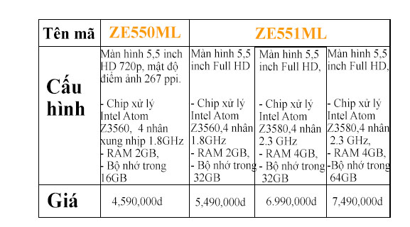 Với mức giá và cấu hình được Asus hướng đến từng đối tượng khách hàng rất rõ ràng. Nếu bạn là sinh viên, hay người dùng bình dân thì phiên bản ZE550ML giá 4,59tr hay ZE551ML 5,49tr chính là 1 lựa chọn tuyệt vời. Khi chúng ra có 1 thiết bị cấu hình khủng với Ram 2Gb, con chip mới giúp chạy đa nhiệm chơi game tốt hơn, màn hình rộng sắc nét và hơn cả là thiết kế không khác biệt so với phiên bản c���u hình cao nhất Ram 4Gb nhưng vẫn hoàn toàn có thể đáp ứng được mọi nhu cầu của người dùng về giải trí và làm việc ở phân khúc này.