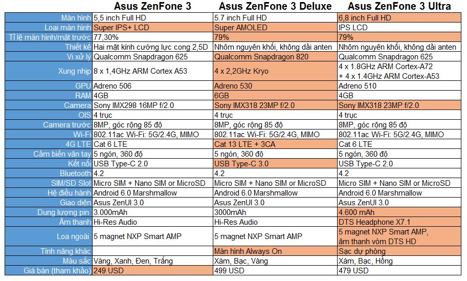 Bên cạnh đó, giá bán của bộ 3 thiết bị này cũng được công bố cho thị trường Mỹ. Cụ thể Zenfone 3 sẽ có giá 249 USD, 499 USD cho Zenfone 3 Deluxe và 479 USD cho phiên bản Zenfone 3 Ultra. Tuy nhiên, hiện tại vẫn chưa có thông tin về thời gian bán ra cho thị trường này.