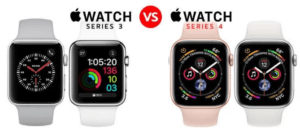Cả hai Series đều có cùng thiết kế cơ bản là mặt đồng hồ hình vuông với cạnh tròn, dây đeo có thể thay đổi được và được làm từ các kim loại khác nhau. Apple Watch S4 có thân mỏng hơn và màn hình lớn hơn nhiều so với S3. Màn hình của nó cũng sắc nét và sáng hơn, dễ nhìn hơn dưới ánh sáng mặt trời, nhiều giao diện đồ hoạ đẹp hơn.Cụ thể, Apple Watch Series 3 có diện tích hiển thị là 740mm vuông trong khi Series 4 có diện tích hiển thị lớn hơn 977mm vuông. Điều này có nghĩa là màn hình của dòng 44mm Series 4 lớn hơn 32% so với Series 3 42mm.Tương tự như vậy đối với các mẫu máy nhỏ hơn, Series 3 phiên bản 38mm có diện tích màn hình 563mm vuông, so với phiên bản 40mm Series 4 với diện tích màn hình 759mm vuông. Vì thế mà kích thước hiển thị cũng tăng lên thêm 35%.