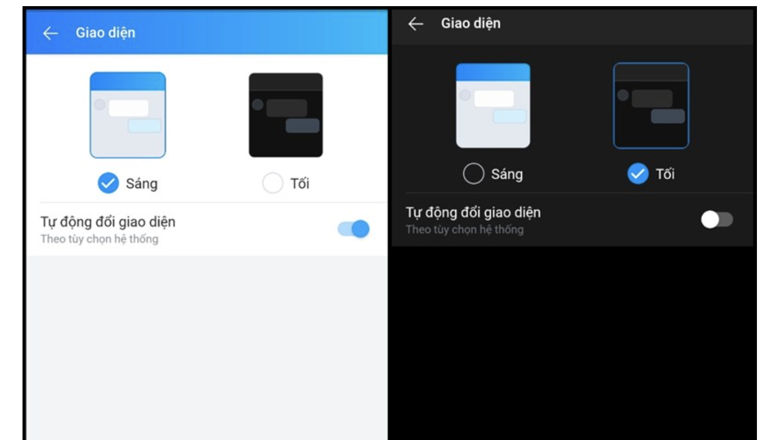 Tại đây bạn có thể tự động điều chỉnh giao diện theo ý mình. Giao diện tối giúp tiết kiệm pin và giảm mỏi mắc khi chúng ta sử dụng Zalo vào ban đêm.