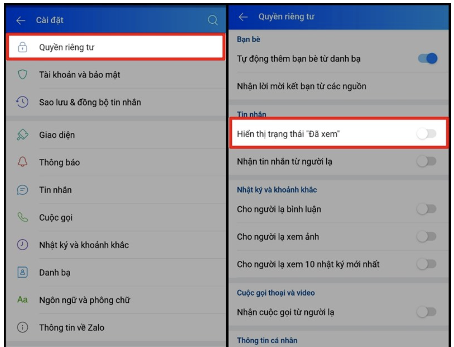 Cũng trong phần Cài đặt của Zalo > Chọn Quyền riêng tư > Tắt tính năng Hiển thị trạng thái đã xem.