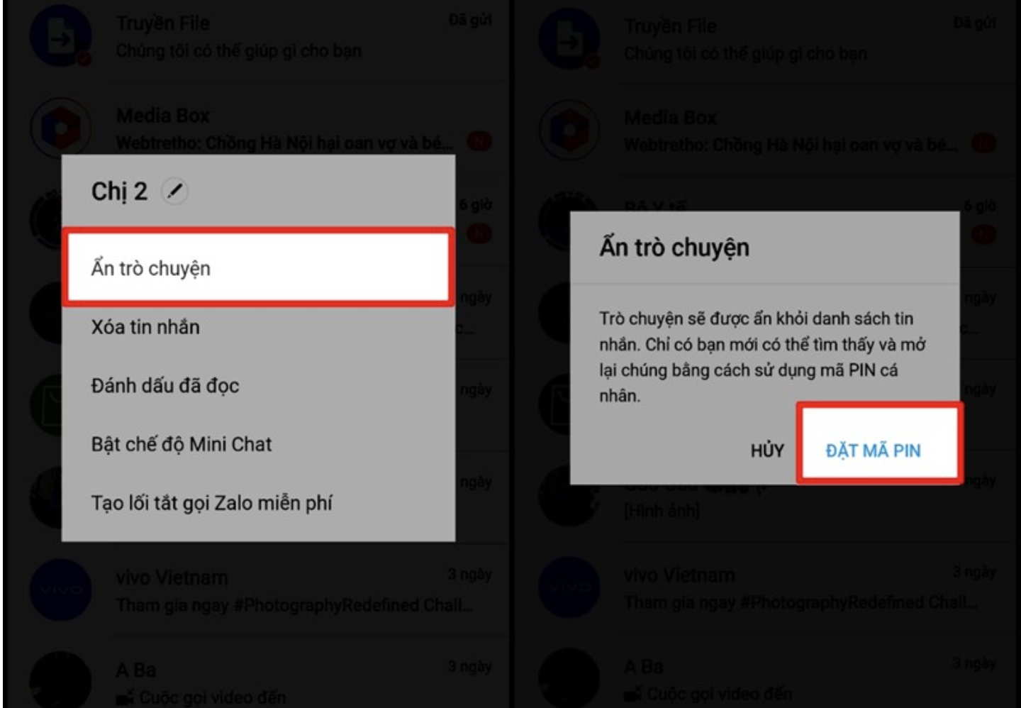 Zalo có một tính năng cực kỳ hay đó là ẩn tin nhắn riêng tư. Để ẩn tin nhắn một ai đó tại giao diện chat của ứng dụng bạn nhấn giữ khung chat của người muốn ẩn > Chọn Ẩn trò chuyện > Đặt mã Pin và ẩn.