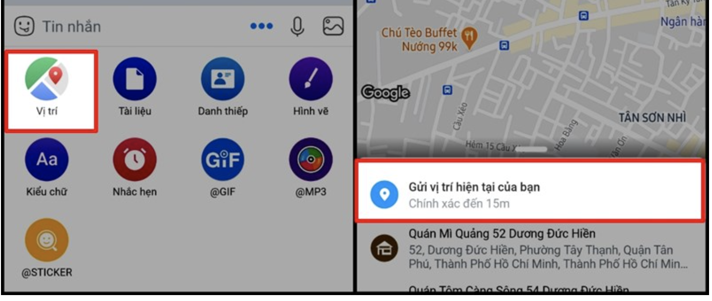 Nếu muốn gửi vị trí của mình cho một ai đó bạn chỉ cần bấm vào tin nhắn với người đó > Chọn dấu 3 chấm nằm ngan > Chọn Vị Trí > Gửi vị trí hiện tại
