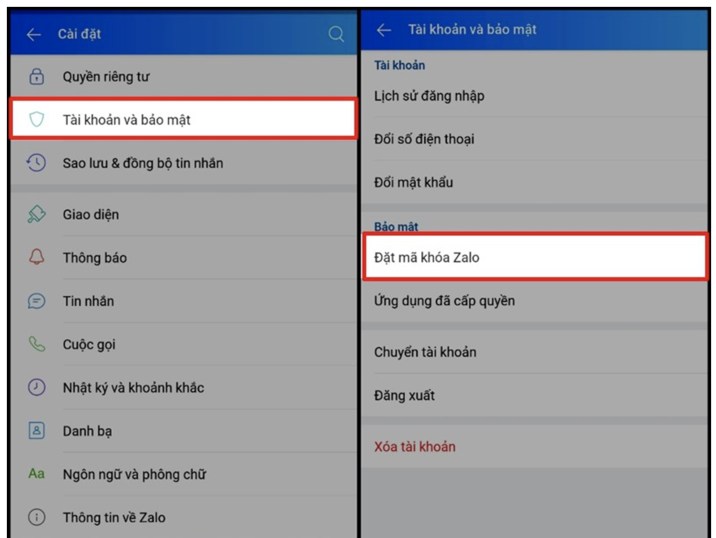 Mở mục Cài đặt trên Zalo > Chọn Tài khoản và bảo mật > Chọn Đặt mã khóa Zalo.