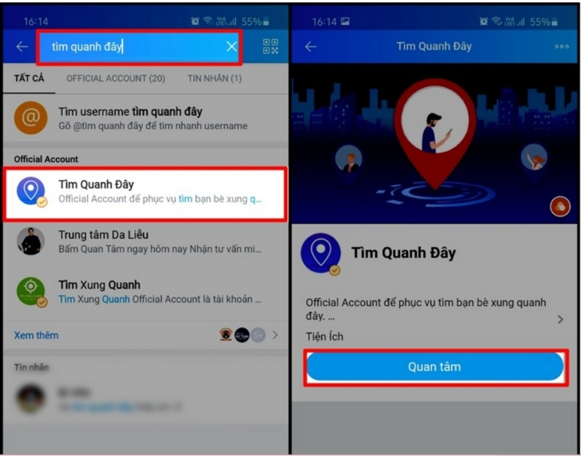 Trên giao diện chính của Zalo gõ “Tìm quanh đây” vào ô tìm kiếm > Chọn Quan tâm.