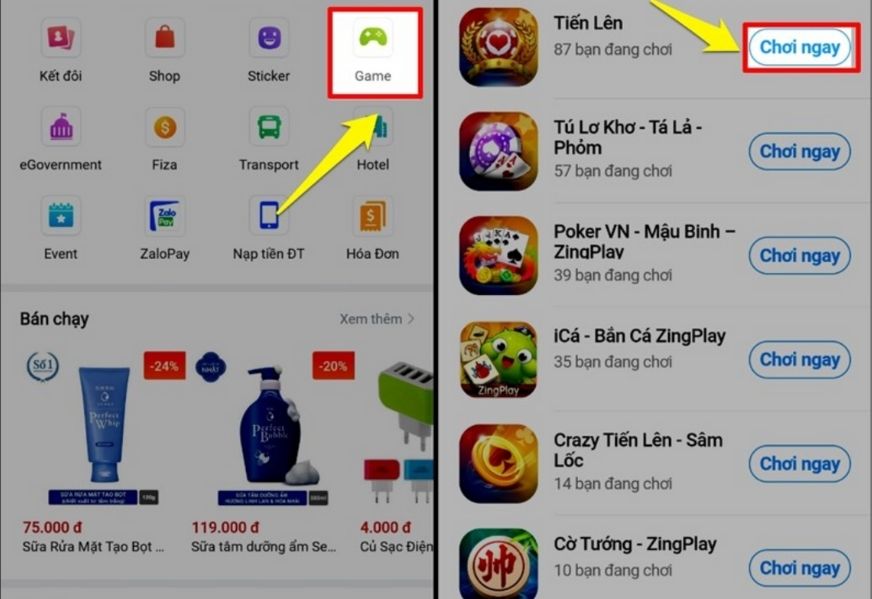 Tại giao diện chính của Zalo > Chọn Game > Chọn trò chơi mình ưa thích > Bấm Chơi ngay.