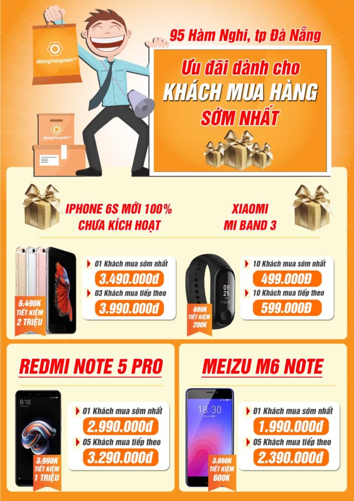 >> Trong ngày 22/07/2018 tại Showroom 95 Hàm Nghi, tp Đà Nẵng, DĐTM sẽ dành ưu đãi dành cho khách xếp hàng mua hàng sớm nhất, các bạn sẽ có cơ hội sở hữu nhiều Smartphone giá cực sốc