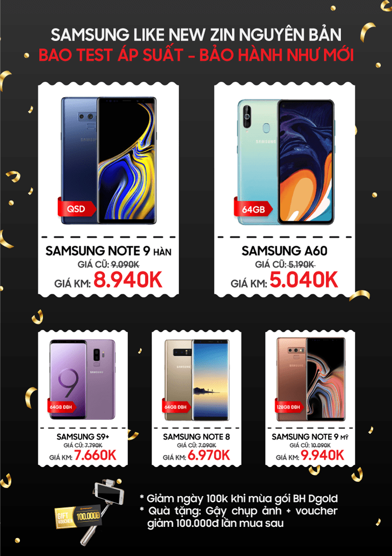 Trong sự kiện Black Friday 29/11 – 1/12, toàn bộ điện thoại Samsung chính hãng tại Di Động Thông Minh sẽ được giảm giá sốc tới 50%, tặng kèm gậy chụp ảnh Selfie và giảm thêm tới 20% khi khách hàng thanh toán quét mã QR qua VNPAY. Cụ thể như sau: