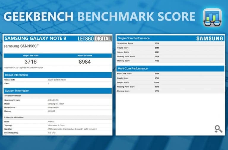 Hai smartphone của Samsung nói trên sở hữu chip Exynos 9810, cùng tiến trình 10nm, riêng bản dành cho thị trường Hoa Kỳ và Trung Quốc, dùng chip Snapdragon 845, 10nm. Cả hai loại chip trên đều được thiết kế tám nhân với 4 nhân hiệu năng và 4 nhân hiệu suất, vượt trội hơn về số lượng so với iPhone 8 Plus chỉ 6 lõi. Nhưng khi đo điểm hiệu năng đơn và đa nhân trên GeekBench, iPhone 8 Plus đánh bật hoàn toàn Galaxy Note 9.