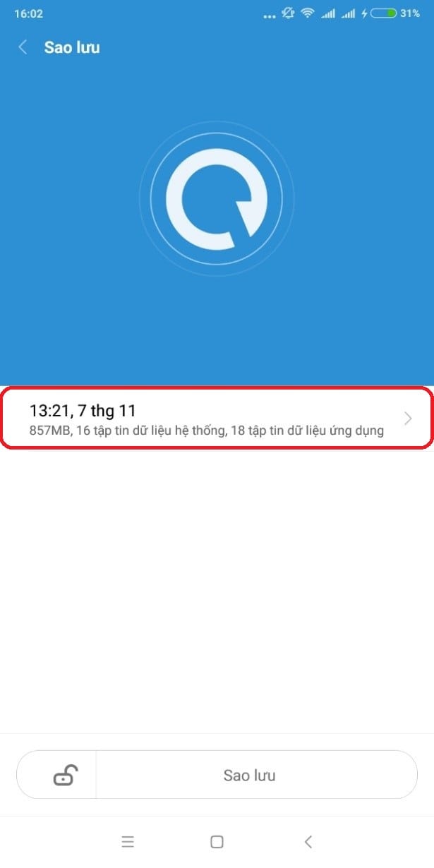 Sao khi sao chép dữ liệu đã sao lưu vào điện thoại, bạn vào mục Sao lưu trên máy khôi phục lại dư liệu. Chọn mục đã khoanh đỏ nhé!