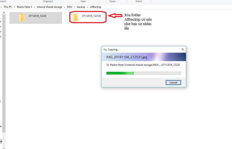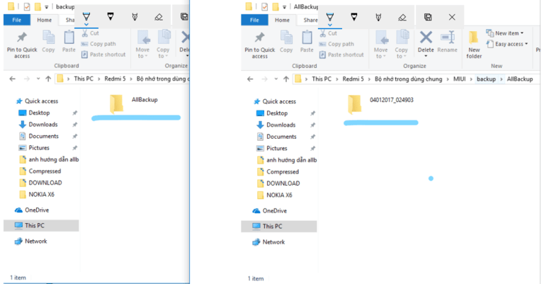 Vào mục bộ nhớ của thiết bị của bạn vào MIUI => backup => Allbackup => chọn vào File đã sao lưu và copy nó vào máy tính.