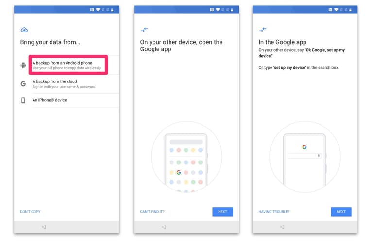 Chung hệ điều hành thì mọi việc luôn dễ dàng, khi mua máy mới mở lên là đã có tuỳ chọn cho bạn bao gồm: Chuyển dữ liệu từ điện thoại Android; Chuyển dữ liệu từ đám mây; Chuyển dữ liệu tù thiết bị iPhone