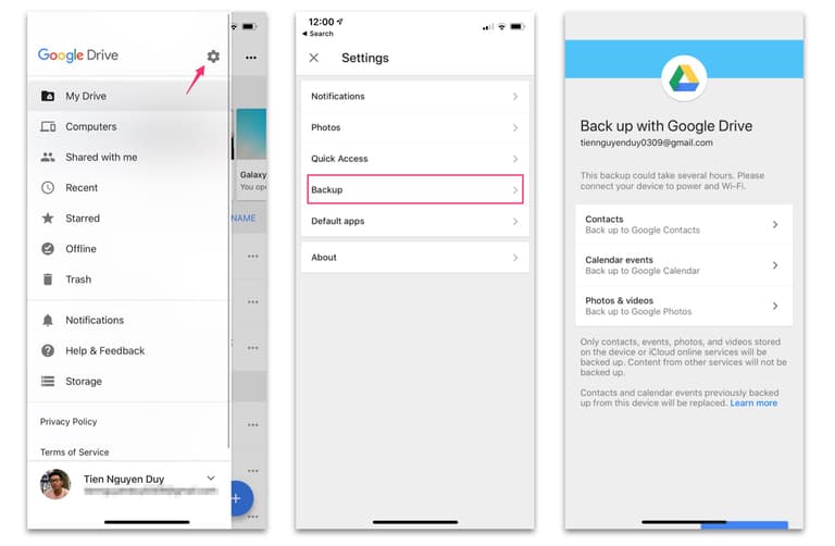 Từ Google Drive trên iPhone – chọn vào biểu tượng settings – chọn Backup – Trong đây sẽ là nơi backup mọi dữ liệu từ danh bạ, lịch, hình ảnh và videos của bạn. Đợi một thời gian để dữ liệu được đồng bộ lên Drive hết, phù thuộc vào dữ liệu trên máy có nặng hay không.