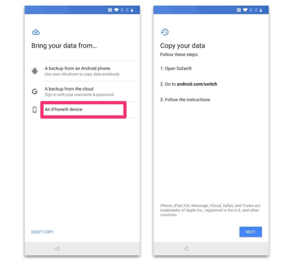 Cũng từ ban đầu mở thiết bị mới, chọn backup “An iPhone device”. Sau đó thiết bị yêu cầu bạn mở Safari trên iPhone và nhập android.com/switch, thật ra trên đó hướng dẫn bạn cách backup từ Google Drive trên iPhone. Mình chia sẻ luôn tại đây: