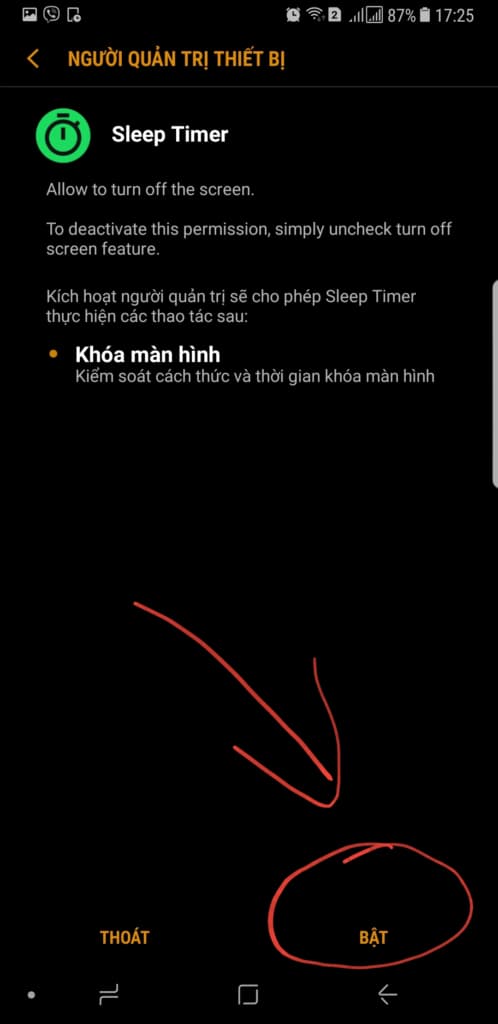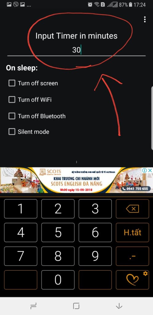 Sau đó tiếp tục nhập số phút vào Input Timer in minutes và hành động chọn thêm tại On Sleep. Bao gồm: