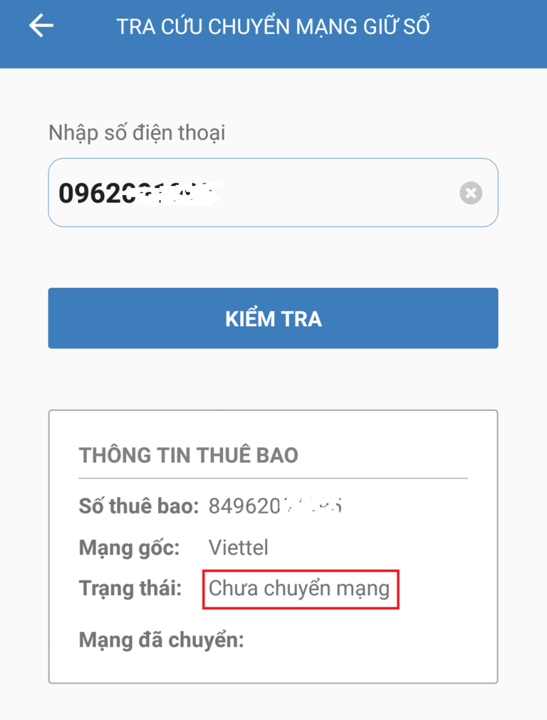 Bước 3: Nhập số thuê bao cần tra cứu > Ấn Kiểm tra > Kết quả và các thông tin sẽ hiện ra và bạn có thể tham khảo. Nó gồm có Số thuê bao, nhà mạng gốc, trạng thái (đã chuyển hay chưa) và nhà mạng chuyển tới là gì.