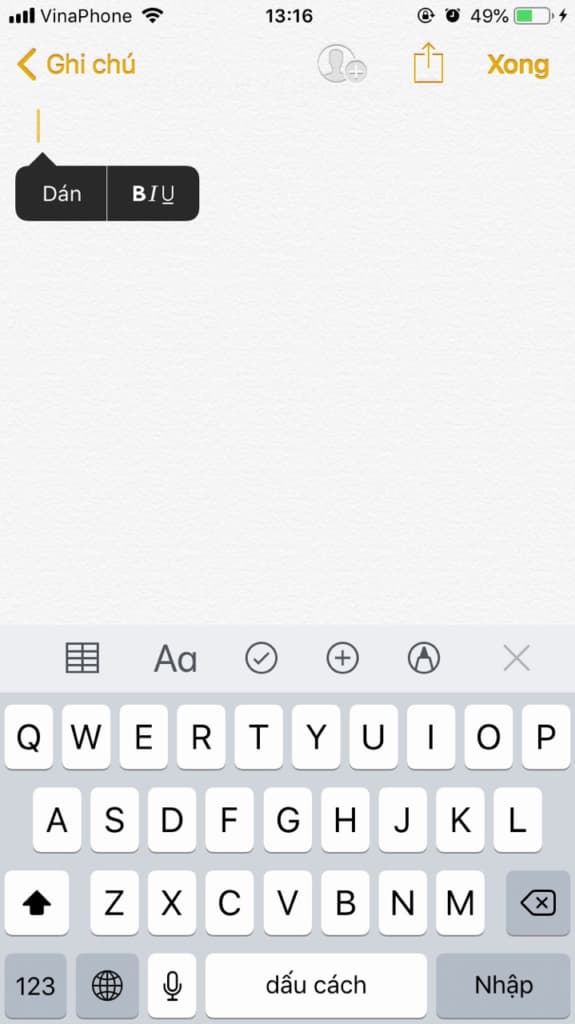 Bước 7: Mở ứng dụng Ghi chú lên. Sau đó trong phần ghi chú mới thì bấm và giữ vào màn hình, chọn Dán