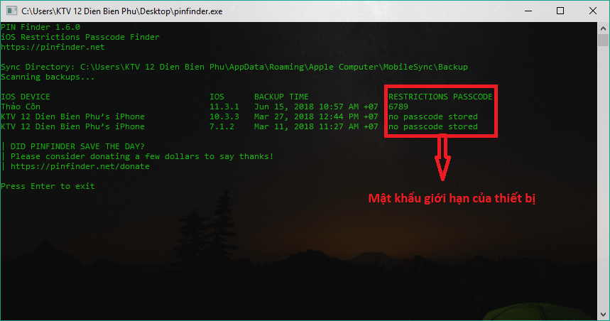 Bước 3: Sau khi hoàn thành quá trình backup, bạn chạy file pinfinder vừa tải về, và bạn sẽ tìm được mật khẩu giới hạn của thiết bị ngay lập tức. Nguyên tắc hoạt động của pinfinder là trích xuất cái mật mã này từ trong file backup, đó là lý do tại sao chúng ta cần máy tính và phải backup trước khi mò.