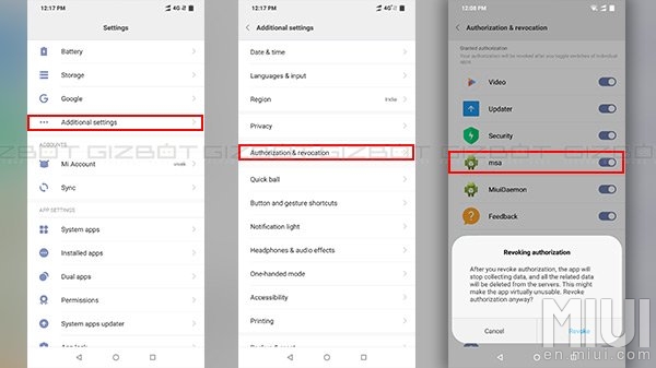 - Truy cập Cài đặt> Cài đặt bổ sung> Ủy quyền và thu hồi> tắt msa để tắt quảng cáo trên toàn hệ thống trên mọi điện thoại thông minh Xiaomi