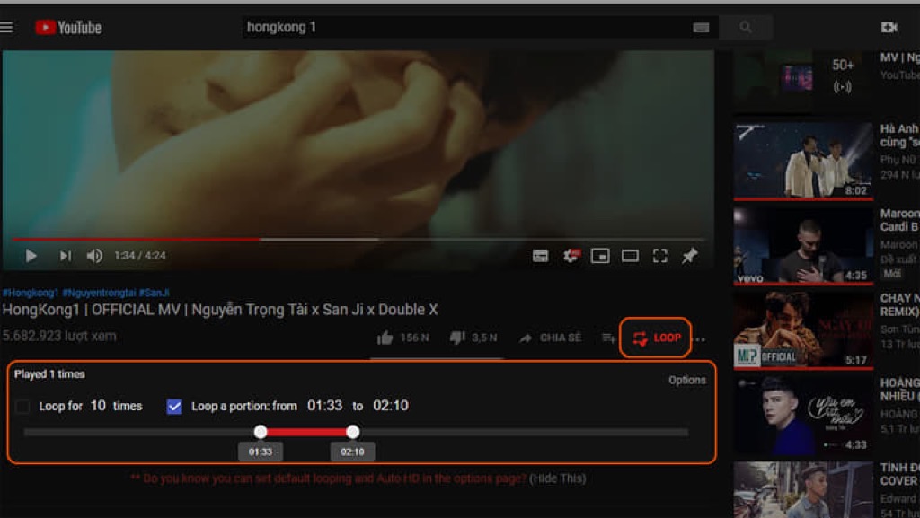Sau khi cài đặt xong tiện ích trên, giờ mỗi lần bạn mở video trên YouTube sẽ có thêm tính năng “Loop” ở thanh công cụ phía dưới. Khi chọn vào đây thì bài hát sẽ tự động lặp lại, còn nếu muốn thiết lập phát lại bao nhiêu lần hoặc phát lại một đoạn trong video thôi thì hãy thiết lập ở dưới.