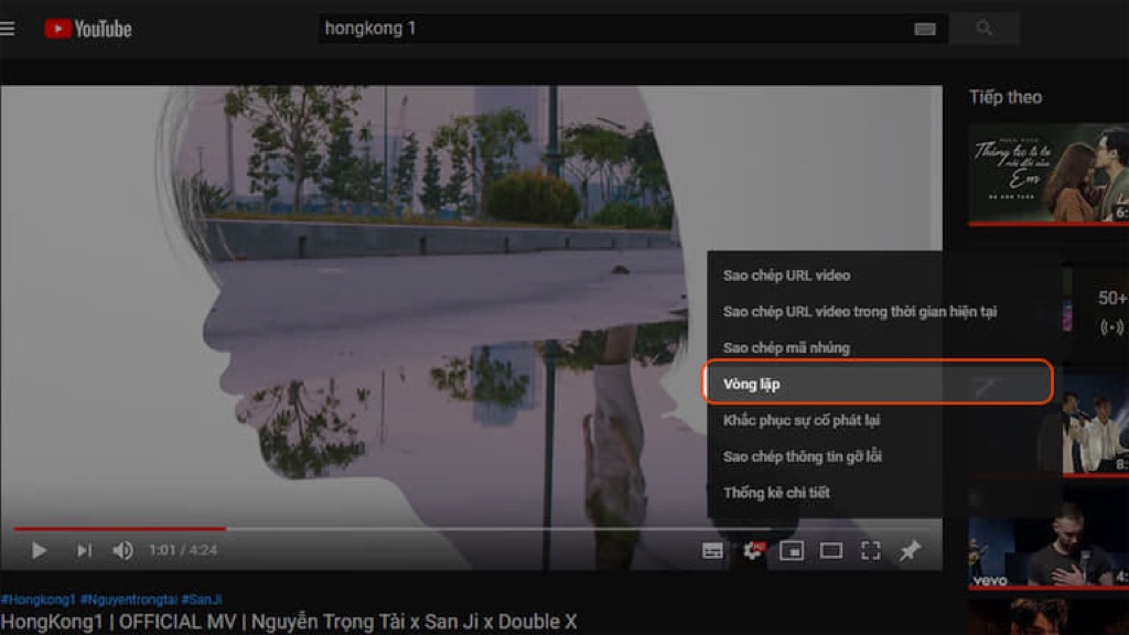 Chúng ta có thể thiết lập phát lại video trên YouTube một cách đơn giản, bằng cách ấn phải chuột vào video trên YouTube > Chọn Vòng lặp (Loop).