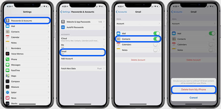 Nếu bạn muốn xóa tất cả địa chỉ liên hệ trên iPhone được liên kết với tài khoản email cụ thể nhưng muốn giữ email được kết nối, hãy đi tới Cài đặt → Mật khẩu & Tài khoản → *Chọn tài khoản của bạn* → Tắt Danh bạ.