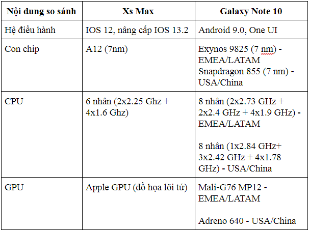 Bảng liệt kê chi tiết cấu hình Xs Max và Galaxy Note 10
