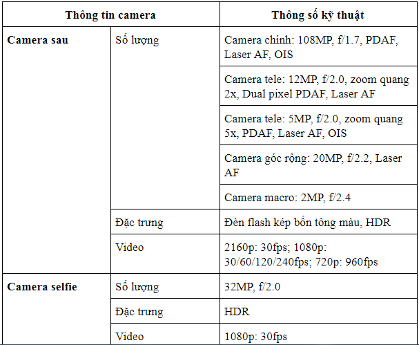 Đây là chiếc smartphone đầu tiên có độ phân giải cảm biến chính lên đến 108MP, bổ sung 2 cảm biến tele (một zoom quang 2x, một zoom quang 5x) để phục vụ tốt nhất nhu cầu chụp ảnh của người dùng, đặc biệt trong điều kiện bạn muốn chụp tấm ảnh sắc nét từ khoảng cách xa vị trí đứng.