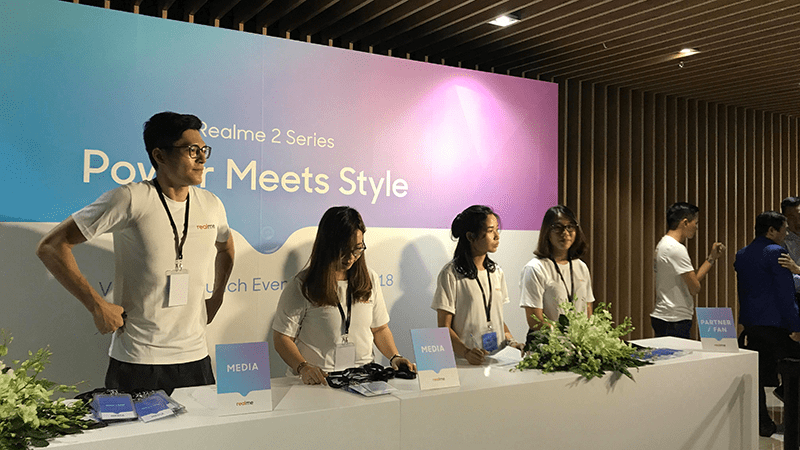 Bàn đón tiếp khách mời nơi diễn ra sự kiện ra mắt Realme 2
