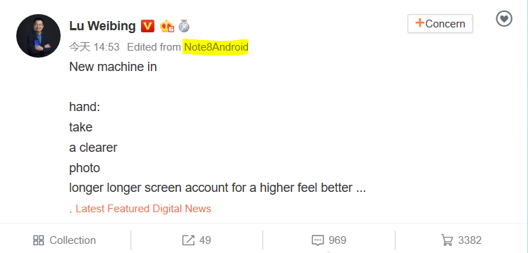 Thậm chí Weibo của Lu Weibing còn hiển thị Redmi Note 8 là thiết bị đã đăng bài viết này.