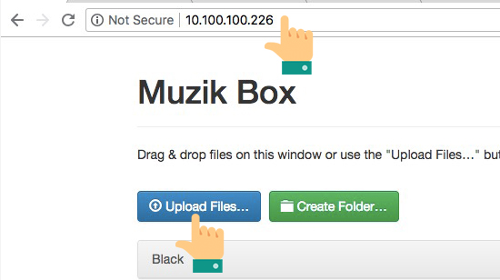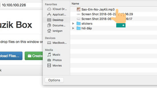 Bước 6: Chuyển qua laptop, máy tính bạn cần truy cập vào địa chỉ ip hiển thị trên điện thoại trên trình duyệt. Sau khi truy cập vào bạn chọn upload files để tiến hành chép nhạc bạn mong muốn lên máy.