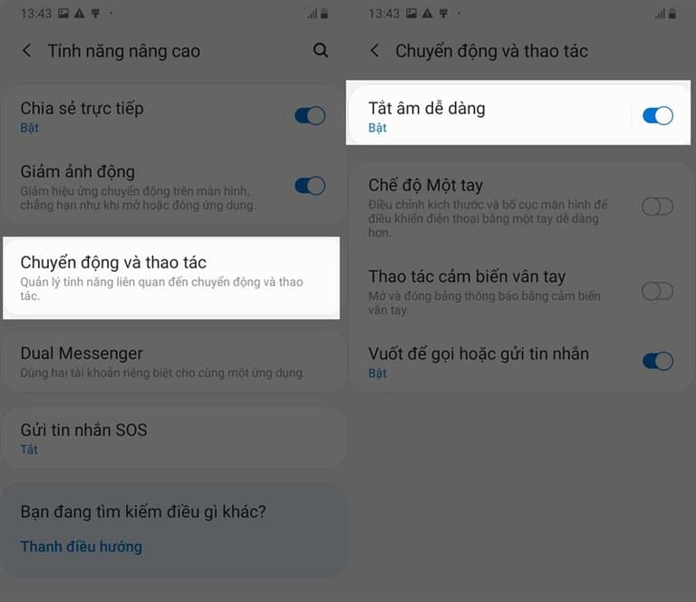 Một chức năng sử dụng cảm biến tiệm cận của máy để tắt chuông điện thoại, trong các cuộc họp hoặc khi làm việc bạn chỉ cần đặt úp màn hình xuống mặt bàn để tránh bị làm phiền. Chỉ vài thao tác đơn giản, bạn vào Cài Đặt > Tính năng nâng cao > Chuyển động và thao tác > Tắt âm dễ dàng.