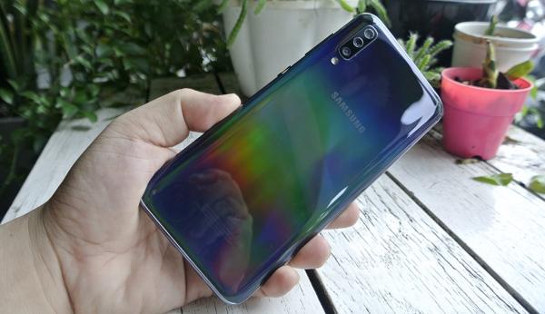 Tùy vào từng góc độ khác nhau mà mặt lưng của Galaxy A70 đen thiên thạch có những sắc màu khác nhau
