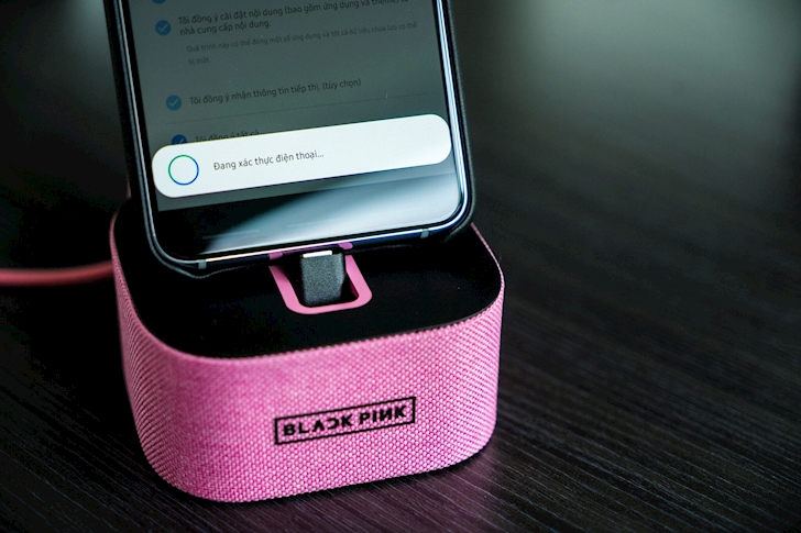 Món quà đầu tiên trong hộp đó chính là dock sạc, công suất cao nhất là 15W. Màu hồng rất xinh xắn, phối màu đen ngầu, đúng phong cách BlackPink.